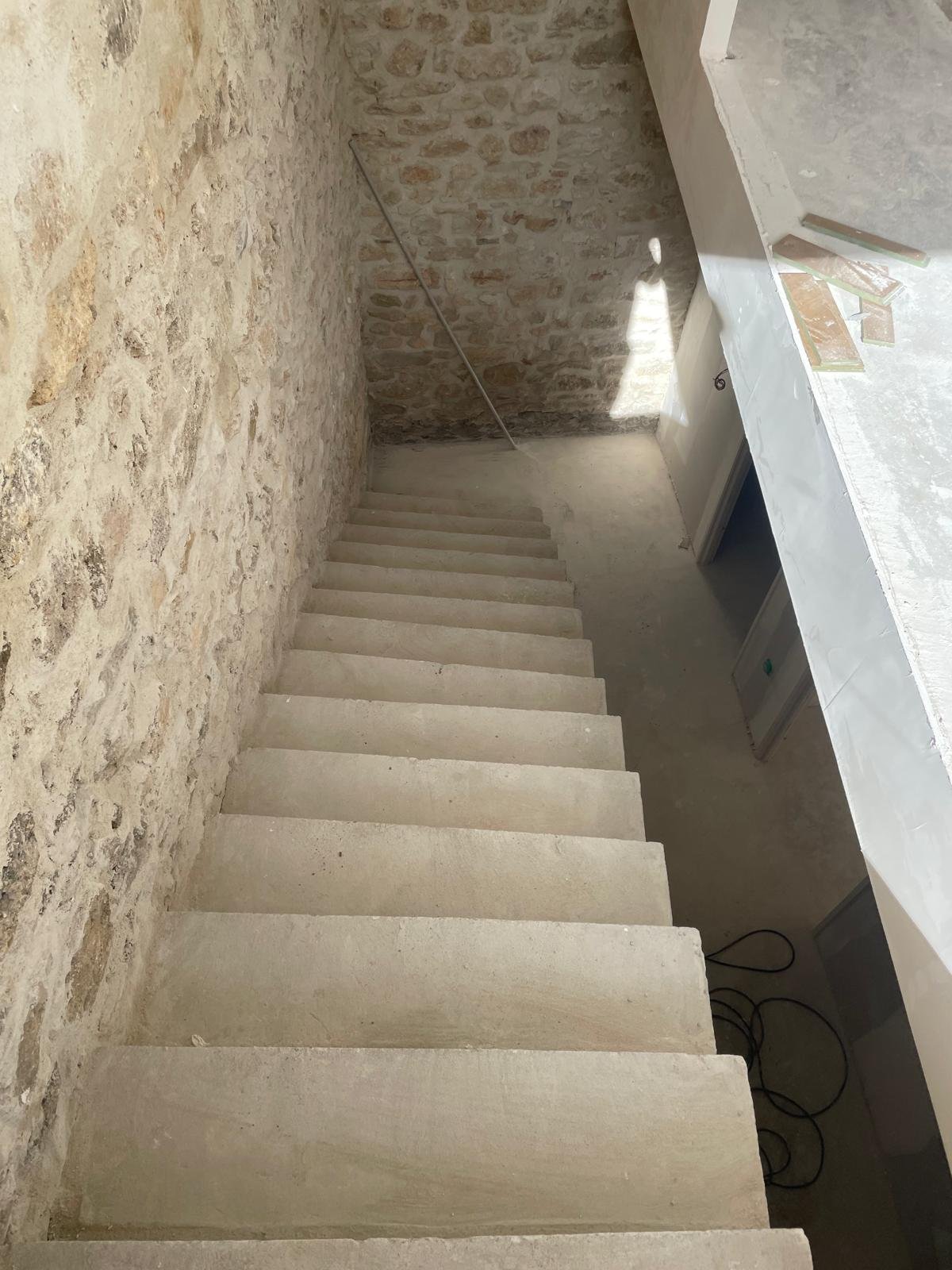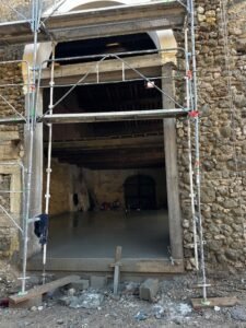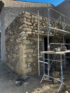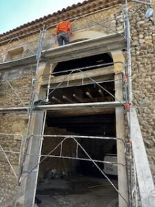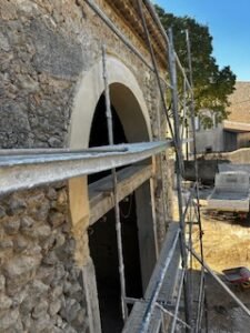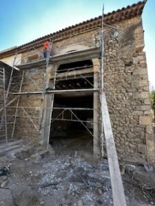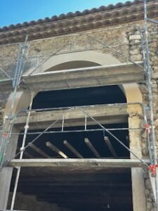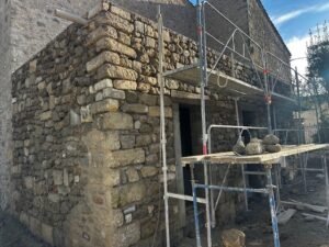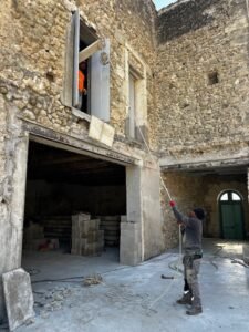 Ce projet d’envergure a porté sur la rénovation complète du bâtiment, tant à l’intérieur qu’à l’extérieur. Les façades ont été entièrement réhabilitées en conservant la pierre d’origine, avec des reprises de joints réalisées exclusivement à la chaux afin de préserver l’authenticité du bâti.