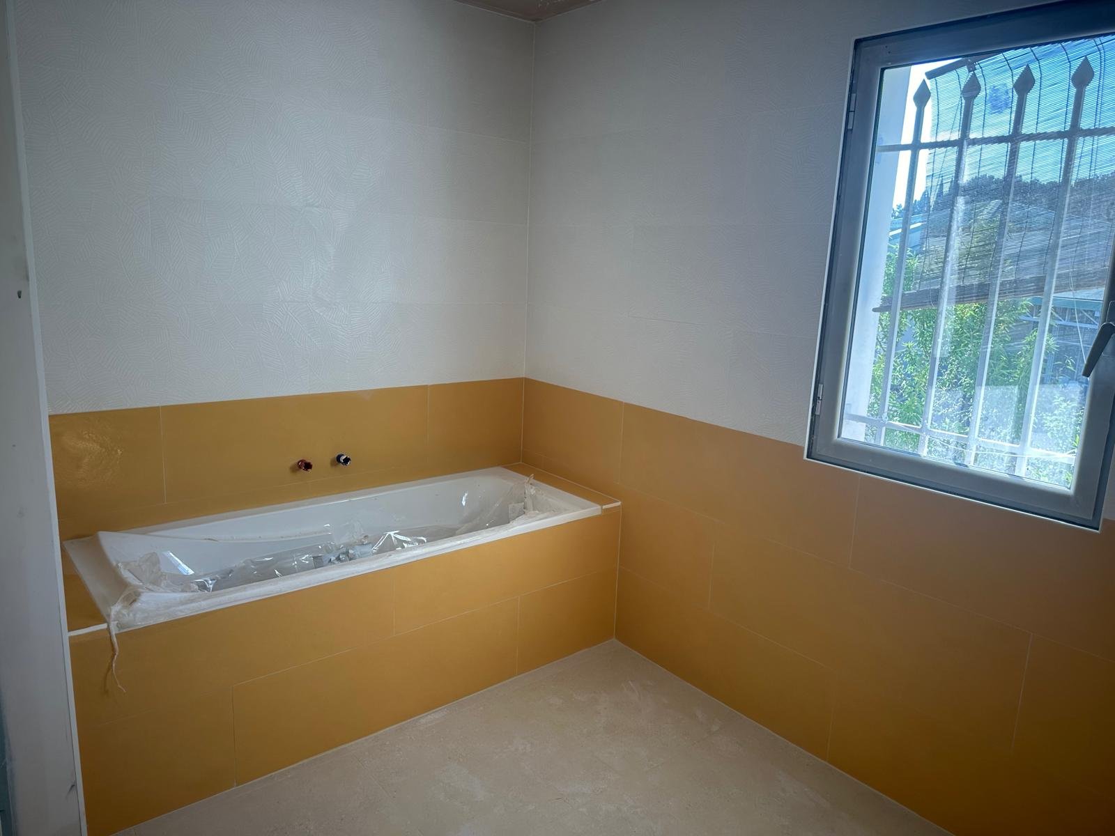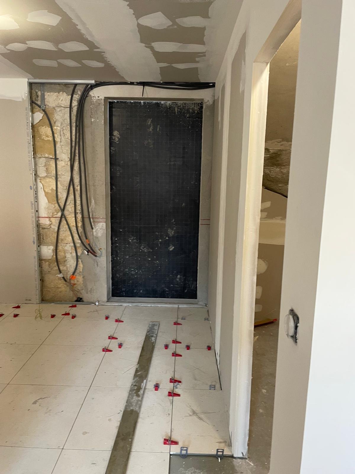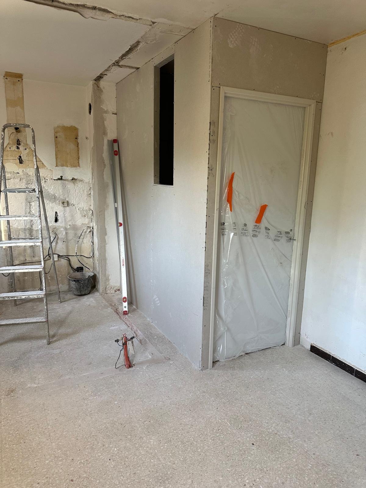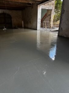 Les travaux se sont poursuivis avec l’aménagement intérieur en plaques de plâtre ainsi que la réalisation des finitions extérieures, incluant un béton balayé pour un rendu moderne et durable.