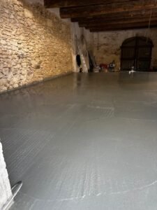 À l’intérieur, le plancher bois existant a été conservé et renforcé par la réalisation d’une chape béton, après étude technique, afin de limiter les vibrations liées à l’ancienne structure en poutres bois.